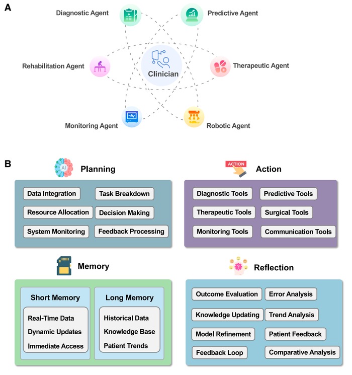 编译丨王聪 编辑丨王多鱼 排版丨水成文 医疗 AI 智能体(medical AI agent)代表了医疗保健领域的变革性范式,其自主性、适应性和对复杂任务的决策能力使其区别于传统的人工智能。 2025 年 9 月 26 日,澳门科技大学张康、霍文逊、澳门城市大学印赟、解放军总医院第一医学中心陈香美院士、中山大学肿瘤防治中心骆卉妍等在 Cell 子刊 Cell Reports Medicine 上发表了题为:A foundational architecture for AI agents in healthcare 的综述论文。 该综述提出了一个基于四大核心组件——规划、行动、反思与记忆的医疗 AI 智能体概念框架,重点考察该框架在关键临床领域的应用——从提升诊断准确率、个性化治疗方案,到指导机器人手术和实现实时患者监测。研究深入分析了实施过程中面临的多重挑战,包括技术集成、临床医生接受度、法规适应性,以及数据隐私和算法偏见等伦理问题。未来发展方向包括向主动式多智能体协作系统的转型,以及具有前瞻性的“AI 智能体医院”概念。尽管这些智能体系统通过提升效率和改善患者预后具有彻底改变医疗服务的巨大潜力,但其成功且公平的落地应用取决于能否克服这些深层次的技术、伦理与监管障碍。